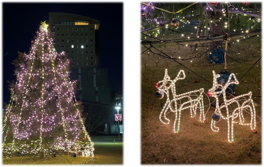 12月を迎え、夜空を彩るクリスマスイルミネーションは冬の風物詩となっています。 和洋学園の国府台キャンパスでもクリスマスツリーのイルミネーションを楽しむことができます。 撮影日:12月5日 《点灯期間》1月31日まで 月曜日~土曜日 16:30~ 20:00 (12/26~1/31クリスマスの飾りを外しての点灯となります