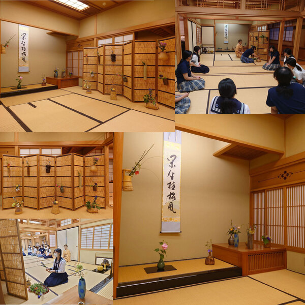 茶道部では毎年二学期半ばに花寄せのお稽古を行っております。今年は多くの部員がいることから全員でお花を持ち寄り、和花や洋花から道端に咲いている雑草まで、様々な植物とともにお稽古に臨みました。高校3年生以外初めての体験かつ普段とは全く違う茶室の風景ということもあり大変賑やかな雰囲気が広がっています。しかし自分の番が回ってくると一変して真剣に花入れとお花を選んでいる部員の姿が印象的でした。毎週見ているはずの先生によって生けられているお花のようにならないという嘆きやなんの変哲もない草も生けてみると意外と様になったりなど様々な知見が広がった様子です。私は亭主役として初めてお稽古をしたのですが、第三者の目線から見る部員によって個性の光る花々は見ていて面白かったです。最終的にもう一周したいという声から全員2周し、全ての花入れにお花がいけられた茶室はまさに圧巻でした。