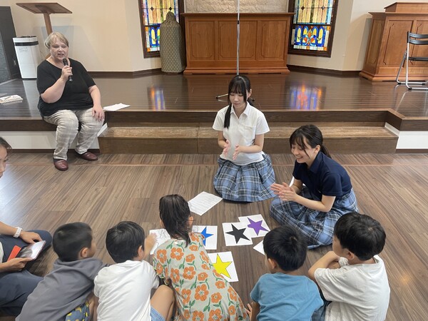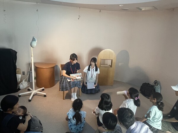今年初めての試みとして、子どもたちに英語で読み聞かせを行う講座を実施しました。今回は高校1年生3名と高校2年生5名が参加しました。8月18日から20日までの3日間、学校で英語絵本の読み方や手遊び歌の練習に取り組みました。生徒たちは「英語をまだ学んでいない子どもたちに、どうすれば楽しんでもらえるか」を考え、それぞれ工夫を凝らして練習を重ねました。