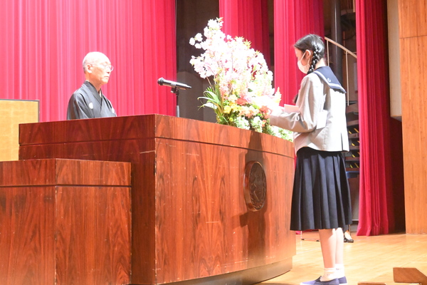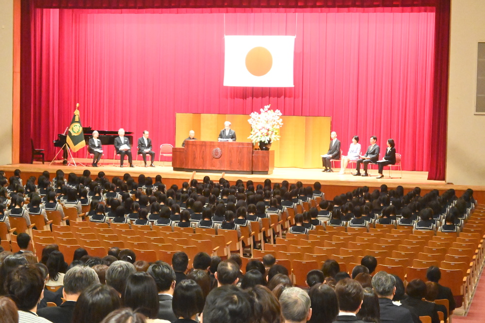 式典では、代表生徒が力強く宣誓。在校生による校歌紹介では、先輩たちの美しい歌声に真剣な表情で見入っていました。