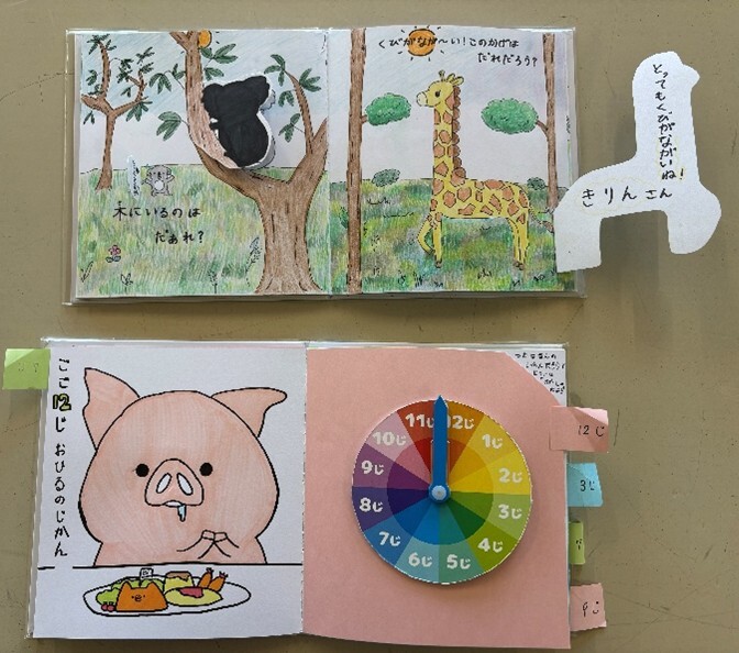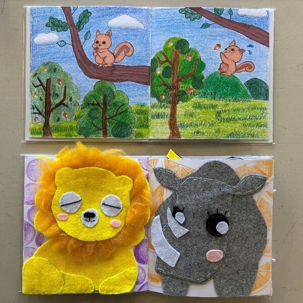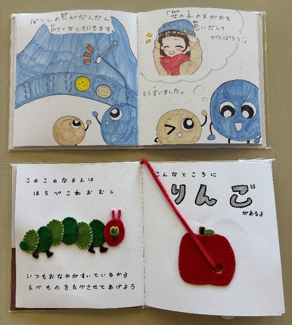 幼児にとって遊び道具は、世界を広げ、心や体の発達を促す大切な存在です。 中学3年生は家庭科の授業で、子どもの発達段階に合わせた「絵本」の制作に取り組みました。 自分が幼いころに好きだった絵本を参考にしたり、学習的な要素を取り入れたり、完全オリジナルのストーリーを考えたりと、読み手に何を伝えたいかをじっくり考えながら、時間をかけて丁寧に仕上げました。将来、保育や子育ての場面でこの経験が活かされる日が来ることを願っています。